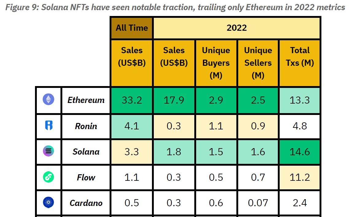 - Ethereum에 비해 저렴한 가스 요금의 혜택을 받은 체인과 함께 NFT는 Solana에게 밝은 부분이었다. Magic Eden과 같은 마켓플레이스는 이러한 노력을 주도하는 데 도움이 되었고 Solana NFT를 새로운 최고치로 끌어올리는 데 도움이 되었다. 위의 그림과 같이, 2022년 통틀어 Solana NFT는 Ethereum다음으로 두번째를 차지했으며, 전체적으로 전체 거래량 3위를 차지하는데 달했다. 다른 한편으로, 최근 대표적인 Solana NFT 컬렉션인 DeGods와 y00ts가 각각 이더리움과 폴리곤으로 브릿지하기 위한 움직임을 발표하는 것을 보았다. 만약 이것이 더 넓은 트렌드의 일부가 된다면, 이는 최근 몇 달 동안 빛나고 있는 Solana 내 하위 부문에 큰 역풍이 될 수 있다.