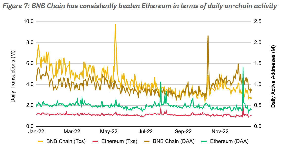 - DeFi에서의 좋은 퍼포먼스와 on-chain 메트릭스의 지속된 강함을 보여준 BNB체인은 비교적 강세인 해를 보냈다. 시가총액은 내려갔지만, 상대적으로 견고한 상태를 유지했다. 2022년 동안 BNB 체인이 ~55%하락할때, 이더리움(-67%), Solana(-93%), 그리고 아발란체(-88%)를 보여줬다.