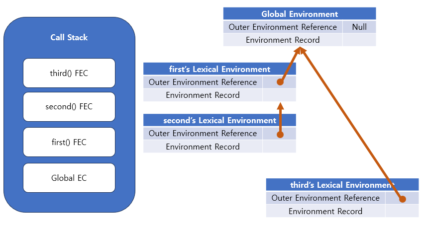 여기서 주의할 점은 콜 스택 상에 쌓여있는 상위 순서대로 참조하는 것은 아니라는 것이다. Lexical Environment에서 Environment Record는 함수의 호출이 아닌 선언 당시의 환경을 파악한다. 즉, 선언 당시에 스코프 체인이 만들어 진다.