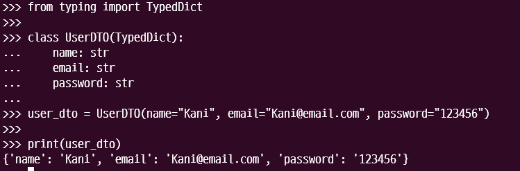 사실 위의 예제는 Java의 Spring에 적용되는 예제가 많다. Python에서 DTO를 주로 어떻게 구현하는지를 알아볼 것인데, 가장 심플한 방법은 Dictionary를 사용하는 것이다. 그 외에도 다양한 방법이 있다. 일단 다음과 같은 방식으로 DTO를 파이썬에서도 정의할 수 있다.
