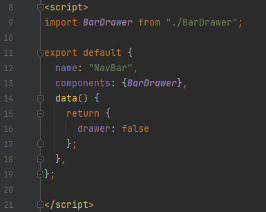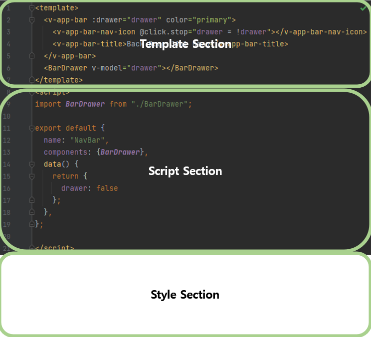 Template파트는 HTML 마크업 코드를 붙여넣는 곳으로, 이와 동시에 데이터 변수라든지, 스크립트에 작성된 코드를 통해 계산된 속성을 넣을 수 있다. 만약 이 Template코드가 굉장히 길다면 이 부분을 자식 컴포넌트로 분리해보는 것을 생각해야 한다. 위의 코드에서느 <BarDrawer ~~></BarDrawer> 부분이 그러한 예시라고 볼 수 있다.
