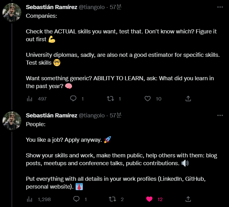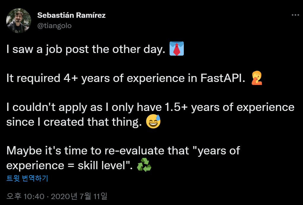 After 2.5 years, when the FastAPI is launched about exactly 4 years, he updated this tweet again, and it gives me many impressions and thinkings. For me, I'm a just junior developer who just met a FastAPI just 1 year ago, It's very impressive for a who want to join a developer. Frankly, I thought "years of experience = skill level", and it is really general thoughts to me. After saw this post, however, I want to ask some question that "Years of Experience is really absolute scale for developer?", and other job.