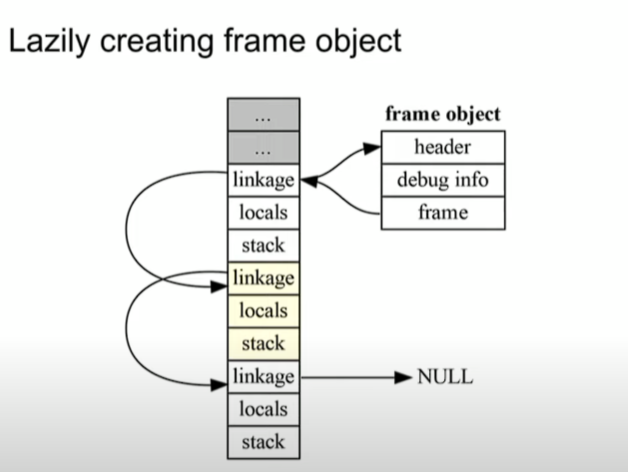 여기서 다른 이야기인 Frame 스택에 대해 이야기하고 넘어가야 할 것 같다. 이 프레임 스택은 파이썬 함수를 부를 때 사용되는 객체이다. 각각의 파이썬 함수를 부를 때 마다, Frame Object를 스택에 넣는다. 이때 이 프레임은 지역 변수, 임시 값을 위한 공간, 이전 프레임, 전역 변수 그외 등등을 위한 참조, 그리고 디버깅 정보를 가지고 있다.