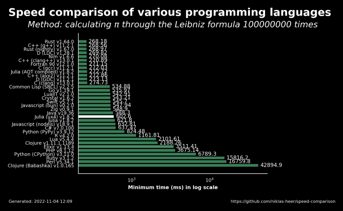 Python, 아주 강력한 인터프리터 언어다. 아주 다양한 곳에 사용되고, Django, FastAPI, Flask를 비롯한 강력한 웹 프레임워크들도 있다. 하지만 한가지 걸리는 점이 있었으니, 바로 이전부터 제기되어왔던 속도 문제였다. 다른 언어와 비교해서 파이썬은 속도에 대해서 약점을 가지고 있다. 물론 태생적인 한계일수도 있다. 아래의 표를 통해 파이썬의 빠르기를 알 수 있을 것이다.