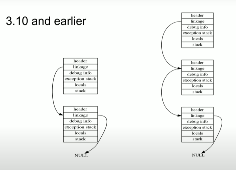 그래서 3.10 이하와 비교했을 때 3.11은 두가지 변경점을 가진다. 먼저 디버깅 정보가 느리게 생성된다. 왜냐하면 이는 기본적으로 Frame Stack의 직접적인 파트가 아니기 때문이다. 그리고 Exception 스택이 버려졌다. 또한 네임 스페이스 Dict이 키값을 가능할 때마다 공유한다.