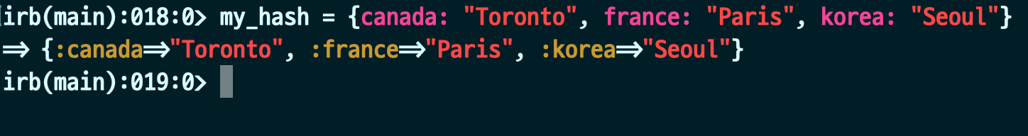 Hashes의 경우 파이썬의 Dictionary와 비슷합니다. {}를 통해 정의할 수 있으며, {key: "value"}를 통해 안에 데이터를 넣을 수 있습니다. 또한 key값을 넣을 때도 my_hash[:key]를 통해 value에 접근할 수 있습니다.