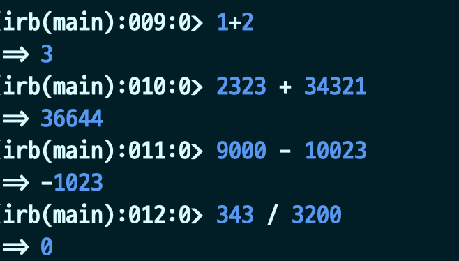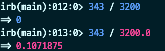 대표적으로 Ruby에는 숫자를 표현하기 위한 데이터 타입이 두가지 있습니다. 바로 Integer와 Float입니다. 위의 경우를 보면 Integer연산이 잘되는 것을 볼 수 있는데, 조금은 특이한 부분이 있습니다. 343/3200의 연산이 float로 표시되지 않고 integer로 표시되는 것입니다.