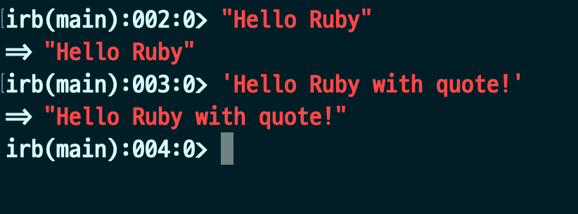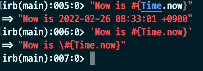 Ruby의 경우 위와 같이 따움표를 통해 문자열을 표시할 수 있습니다. 여기서 쌍따움표와 따움표 사이에 차이가 있는데요. ""의 경우 파이썬의 f-string처럼 중간에 값을 넣어줄 수 있지만, ''의 경우는 불가능하다는 것입니다. 이때 f-string처럼 넣어줄 수 있는 문법은 Ruby에서는 다음과 같습니다.