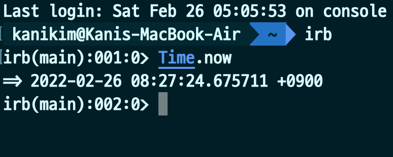 이제 본격적으로 이곳에서 코드를 쳐보며 놀아보면 됩니다! 그러면 현재 시간을 출력해보겠습니다. irb에다가 "Time.now"를 치면 됩니다.