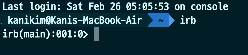 irb는 간단하게 말해 python을 터미널에 쳐서 나오는 인터프리터 상호작용 환경입니다. 단순합니다. Ruby가 깔린 상태에서 irb를 그대로 치면 됩니다. 그러면 다음과 같은 화면이 나옵니다.