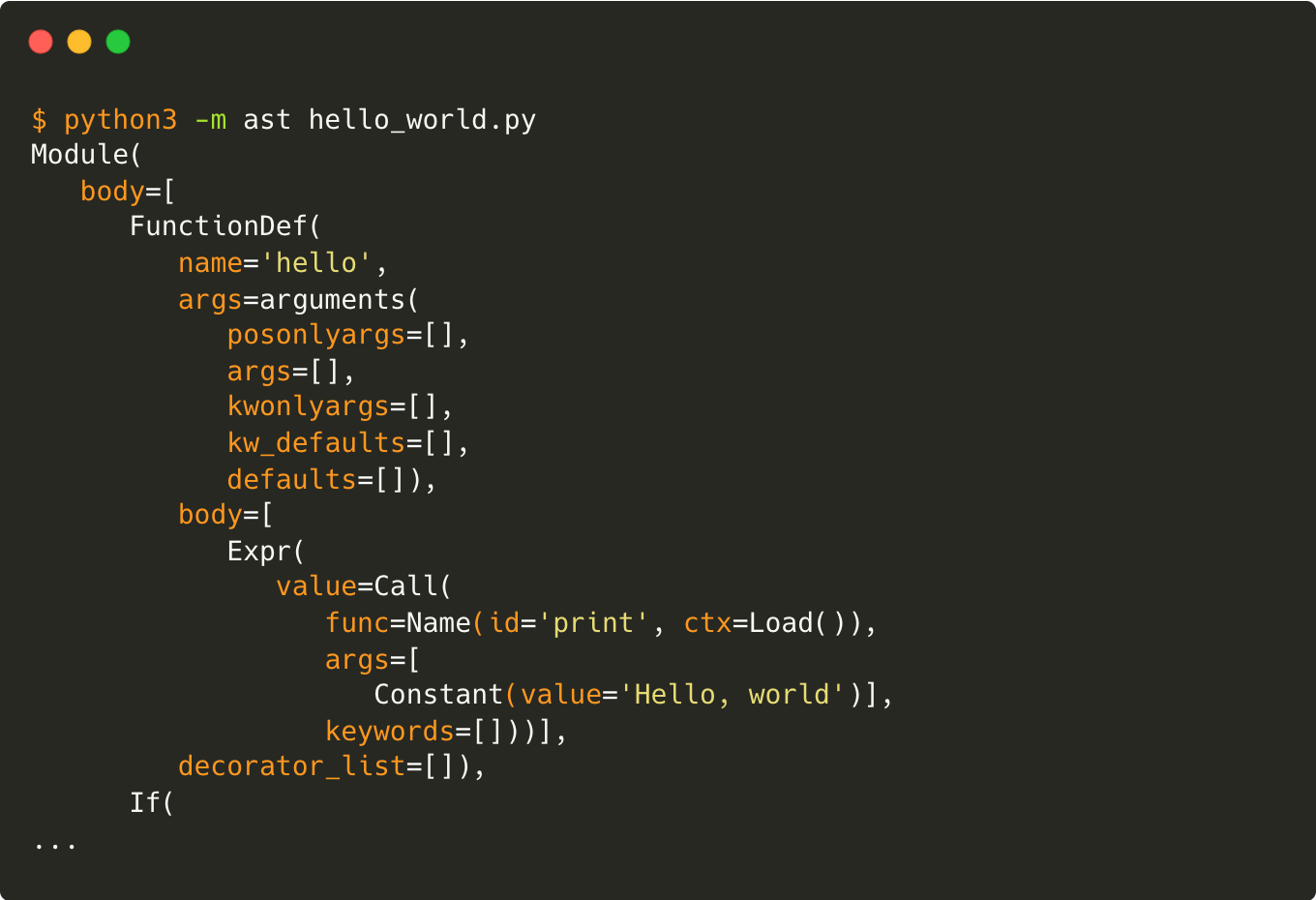 - 표준 라이브러리인 AST모듈은 파이썬 소스코드를 추상화해서 출력한다.