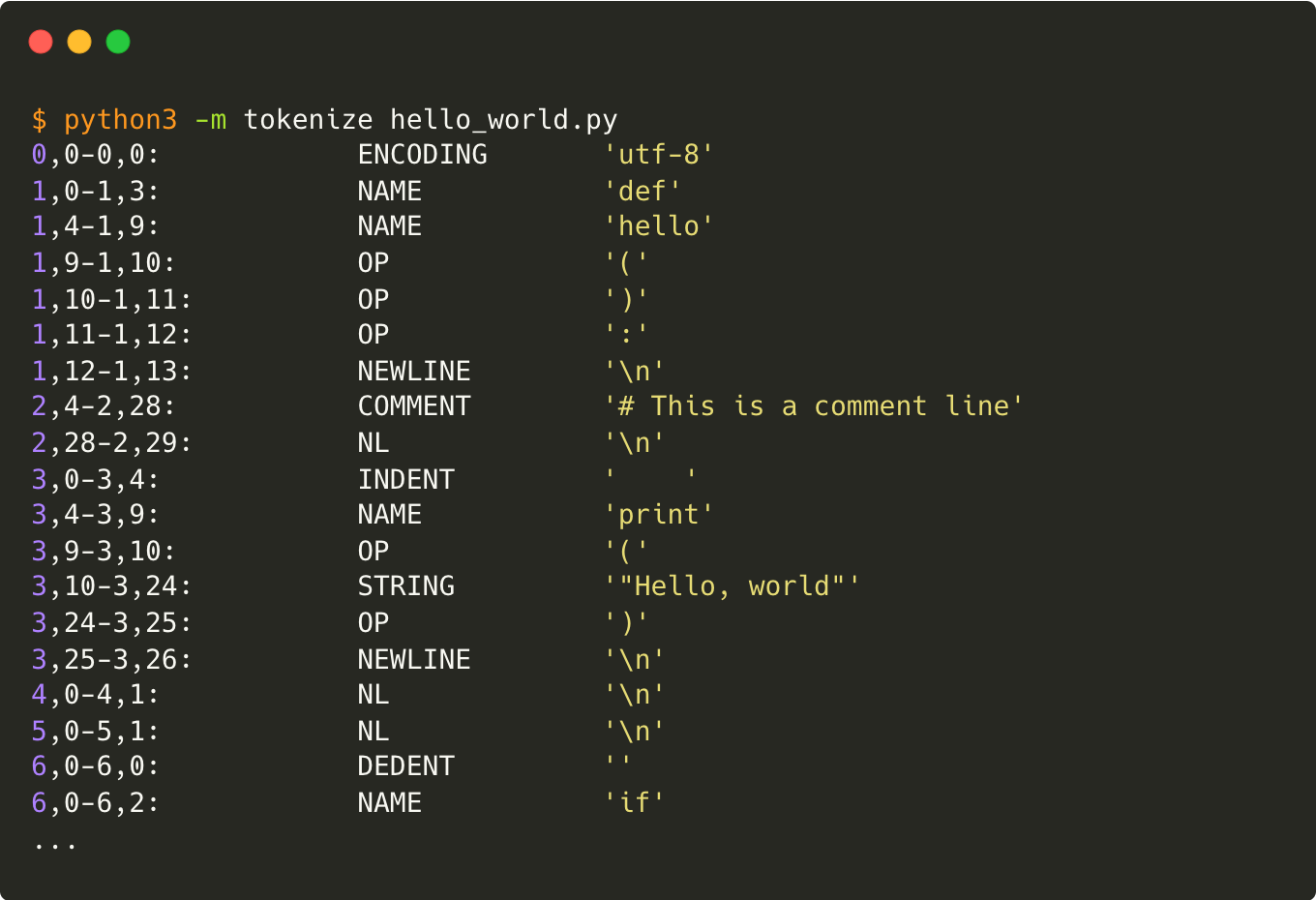 - 표준 라이브러리인 tokenize모듈은 파이썬 소스코드를 토큰으로 분해해서 출력한다.