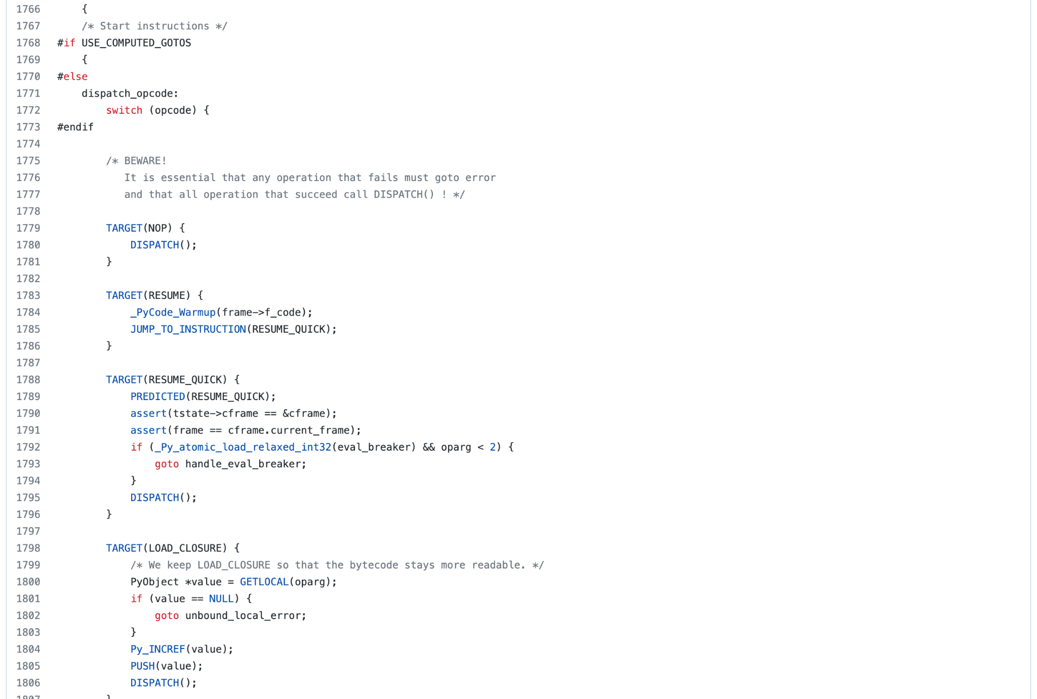 - 실제 코드는 Python/ceval.c에 기술되어 있는 거대한 루프이다.
