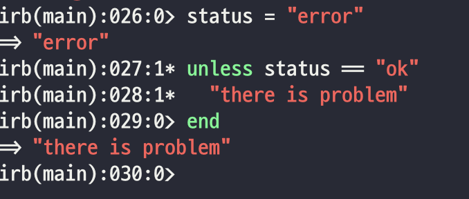 의 예시에서 쓴 unless status == "ok"를 if문으로 바꾸어 보면 if status != "ok"가 됩니다.
