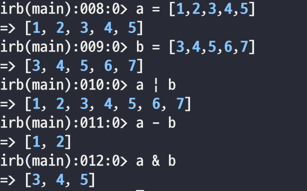 먼저 | 의 경우 두 배열의 합집합입니다. &의 경우 교집합 그리고 -는 차집합 연산을 합니다. 보통 이런 경우 파이썬의 set을 떠오르기 마련입니다. Ruby에도 물론 Set이 있습니다. 집합 연산을 할경우 사실 Set을 사용하는 것을 권고합니다.