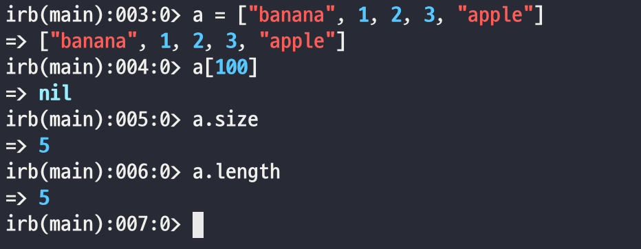 그 외에도 특이한 점은 만약 배열 길이를 넘어가는 숫자를 인덱스로 넣어주면 보통은 에러를 띄우겠지만, Ruby의 경우는 nil을 띄워줍니다. 그 외에도 배열의 길이를 확인하는 방법으로는 variable.length 또는 variable.size인데, 이 둘의 차이에 대해서는 나중에 설명하겠습니다.