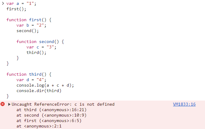 그 이유인 즉슨, 이미 third()와 first()는 전역 함수로서 당시 선언된 전역 변수 상태의 정보만 담고 있어서 second와 first내의 변수 정보들에 대해서는 알 턱이 없다.