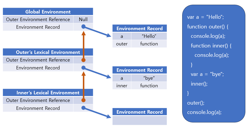 여기서 주의할 점은 콜 스택 상에 쌓여있는 상위 순서대로 참조하는 것은 아니라는 것이다. Lexical Environment에서 Environment Record는 함수의 호출이 아닌 선언 당시의 환경을 파악한다. 즉, 선언 당시에 스코프 체인이 만들어 진다.