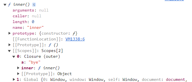 위의 Lexical Environment끼리 연결되어 있는 것이 바로 Scope Chain이다. 스코프 체인은 결국 유효 범위 스코프를 한번 탐색하고 해당 변수나 함수가 없을 경우 외부 환경을 탐색해 나가면서 하나하나 찾아나가는 것이다. 최종적으로는 global environment에 당도하게 된다. 이는 코드에 console.dir(inner)를 넣어서 더욱 자세하게 파악할 수 있다.
