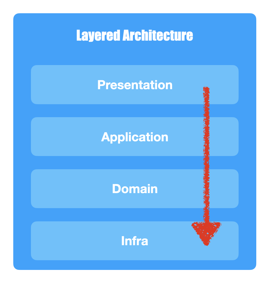 결론적으로 정리해 보자면, 가장 밑에 데이터베이스 및 영속성 계층이 있으며, 그 위에 비즈니스 계층이 있고 그러한 비즈니스 계층에서 도메인 로직이 이루어진다. 가장 큰 단점이면서 장점이라고 생각하는 것이 바로 밑으로 내려가면서 종속성을 띄는 것이다. 위로 거슬러 올라가기 힘들다는 단점이자 장점이 있다고 생각한다.