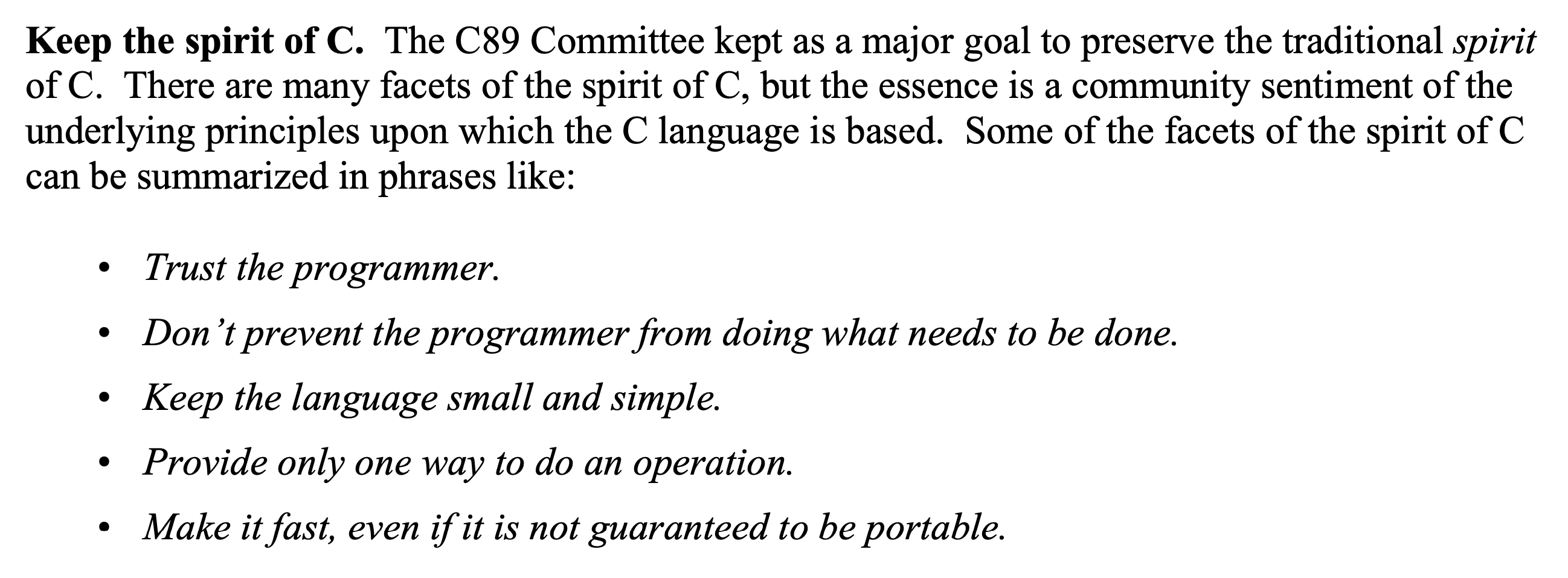 C의 정신을 지키라. C89 위원회는 C의 전통적인 정신을 보존하는 것을 주요 목표로 삼았습니다. C의 정신에는 많은 측면이 있지만, 그 본질은 C 언어가 기반하고 있는 15가지 근본 원칙에 대한 커뮤니티의 정서입니다. C의 정신의 일부 측면들은 "간결함", "이식성", "효율성" 등의 문구로 요약될 수 있습니다.