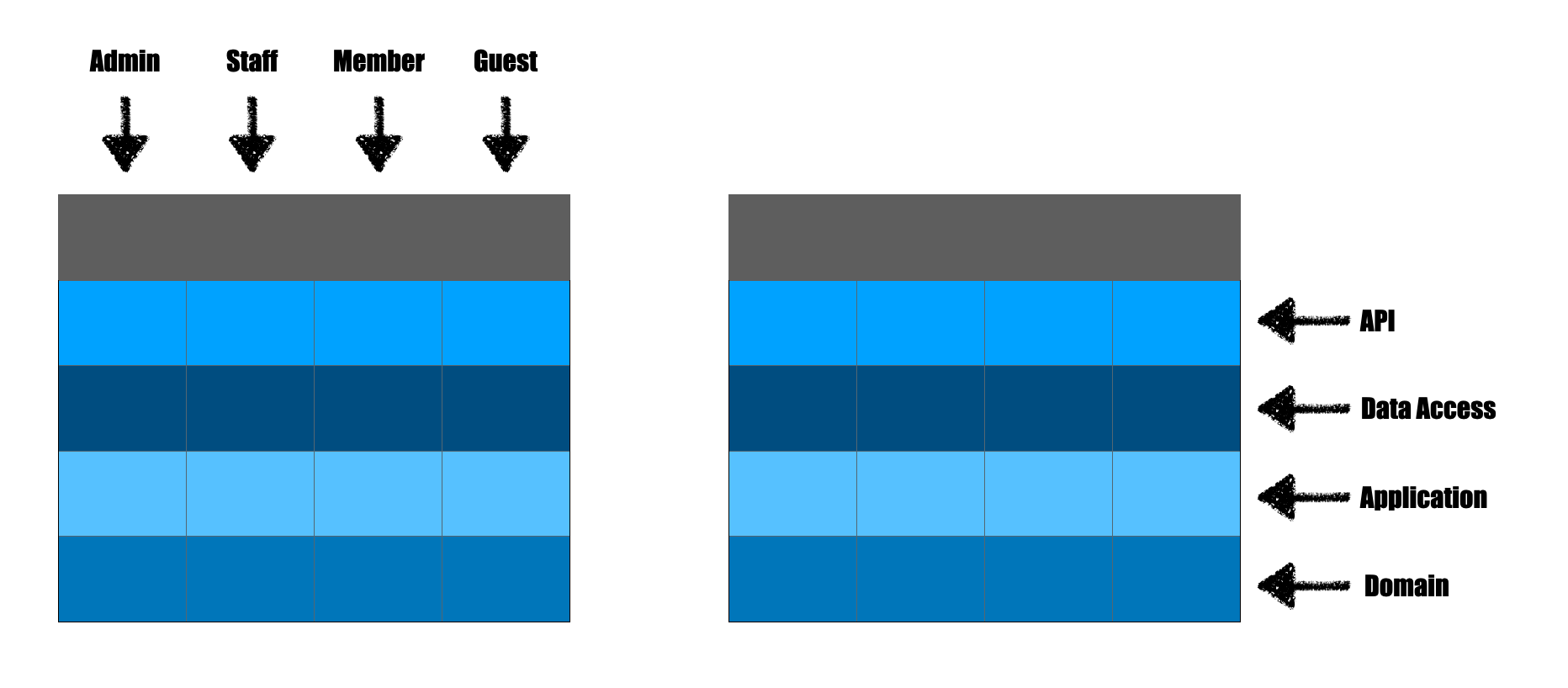 - SoC (Separation of Concerns): 기능을 구현하려면 인프라, 애플리케이션 및 도메인 계층 로직의 조합에 의존해야 한다. SoC 원칙은 기능의 "기술적" 구현 세부 정보를 구분하도록 촉구합니다. 이를 위해 계층화된 아키텍처(수평)를 구현할 수 있다.