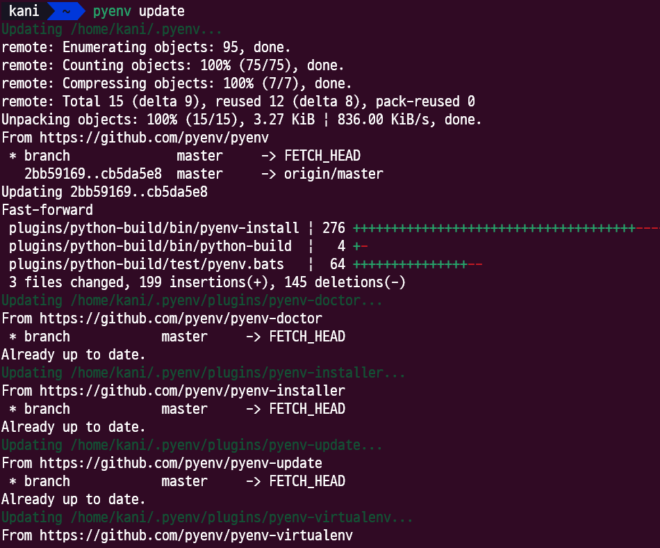 위의 명령어를 입력하면 자연스럽게 버전이 나온다. 그 외에도 pyenv update를 해주면 아래의 사진과 같이 자동으로 업데이트를 해준다.